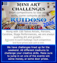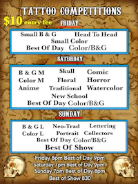 Best of Day and Best of Show Tattoos need to be started and finished at the Expo. Friday and Saturday contest registration is from 4pm to 8pm. Judging begins immediately after. Best of day for Friday and Saturday will close at 9pm. Best of day trophy will be given at 10pm.